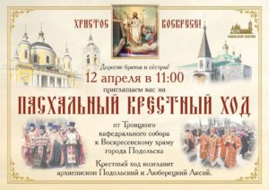 Дорогие братья и сестры, приглашаем вас принять участие в Пасхальном Крестном ходе 12 апреля в 11:00, который возглавит архиепископ Подольский и Люберецкий Аксий. Крестный ход последует от Троицкого Кафедрального собора к Воскресенсому храму Подольска.
